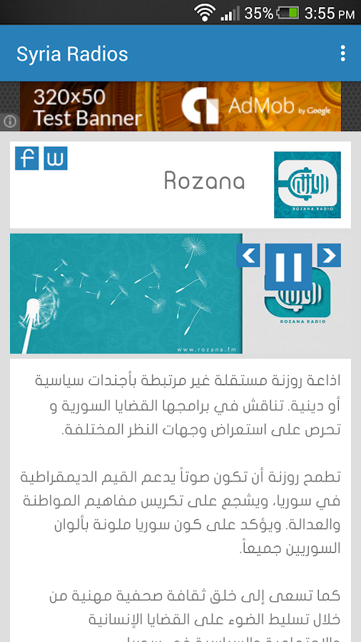وأتمنى لكل يد عاملة فيه, بالتوفيق والإبداع أكثر وأكثر, لتنتشر أكثر تطبيقاتنا وأبداعتنا في بلادي الحبيبة سوريا, التطبيق يحتوي على مجموعة رائعة من قنوات الراديو, تستطيع الاستماع المباشر لهذه القنوات, كما هناك قسم الأرشفة يحتوي على مقاطع قد سجلت سابقاً, وهناك قسم رائع لتصفح الأخبار. مجموعة جيدة.